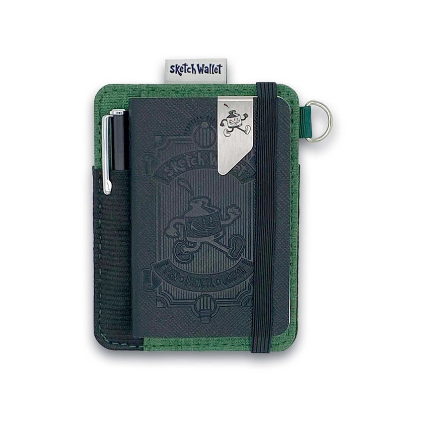 Canvas Slim Sketch Wallet. Our slimmest wallet yet! Comes with our standard small sketchbook, a metal clip and is packed in a foil embossed gift box. It has an elastic band to keep your book closed. There are 2 RFID card pockets along with an elastic pocket to keep all your cards or folded cash. Each slim wallet comes with two elastic pockets for a short pencil or pen, one on each side. Works great as a front or back pocket wallet or for use with a wristlet or lanyard.
