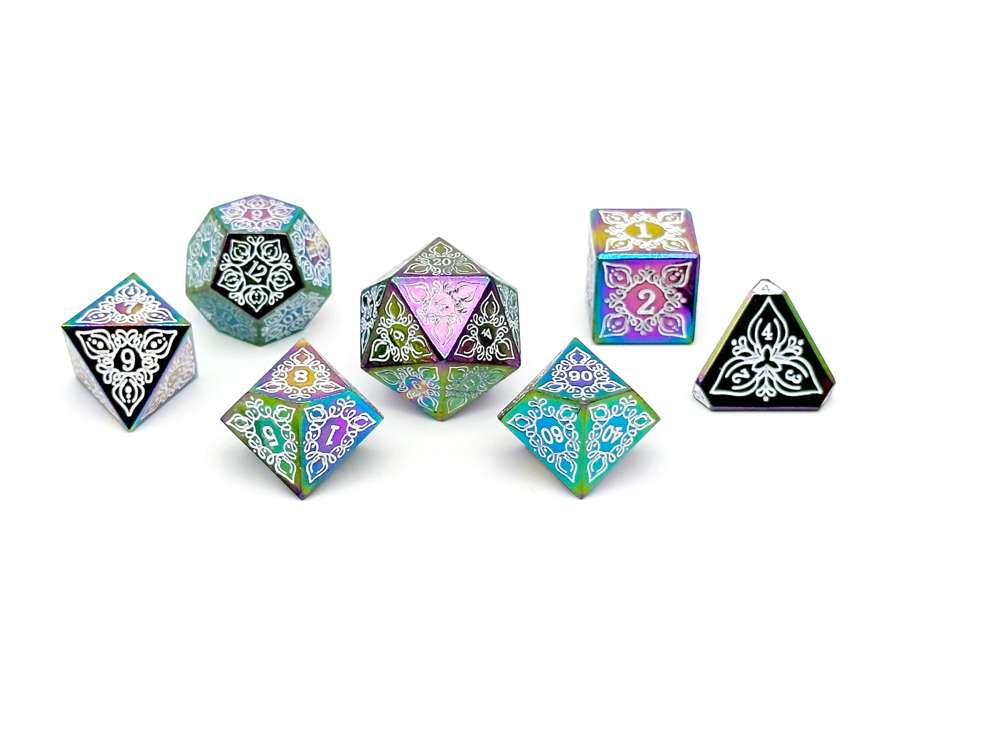 Introducing the enchanting marvel, Feyweave - Feybane Dice Set, a captivating testament to the extraordinary collaboration between Norse Foundry and Yaniir. Forged from scorched alloy and adorned with mesmerizing white enamel fill, this 7-piece dice set invites you to explore a world where creativity and innovation intertwine seamlessly.
