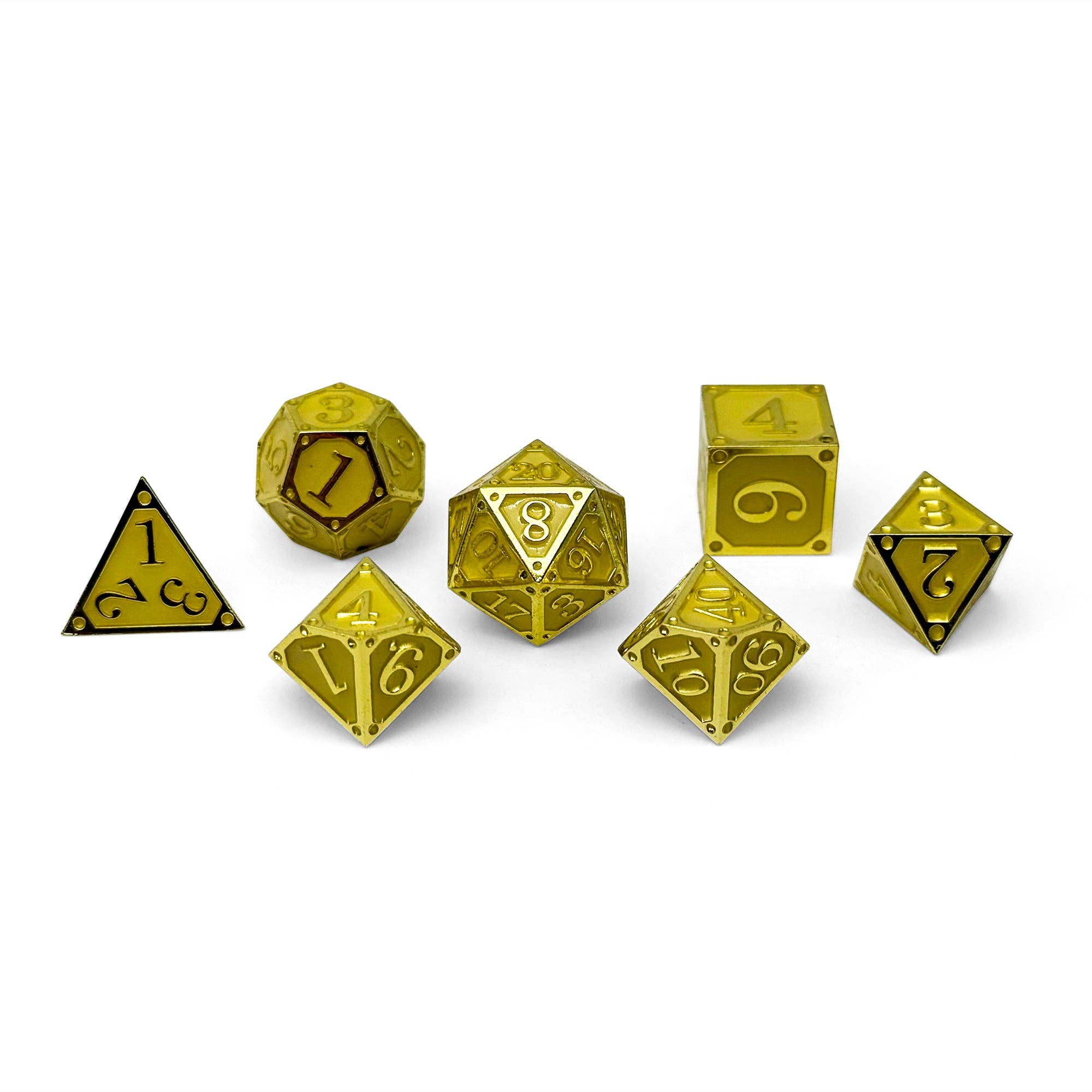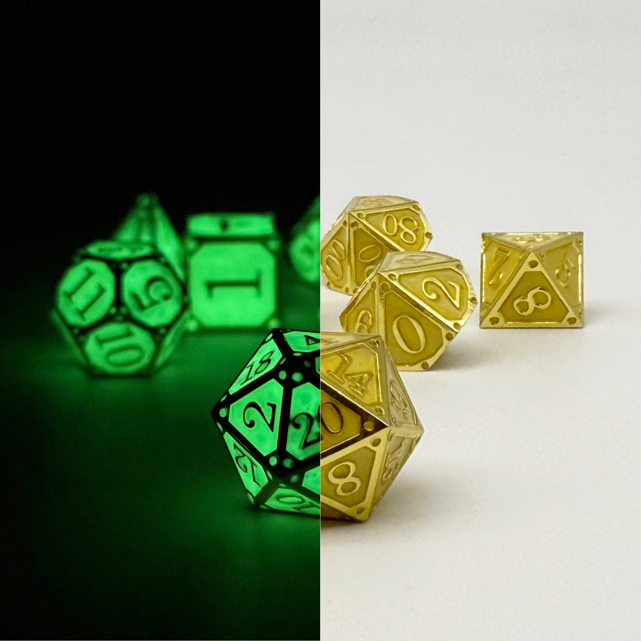 Illuminate your adventures with the brilliance of the Storybook - Crystals of Light dice set. Forged in shimmering gold and infused with radiant magic, these dice shine like treasures pulled from celestial vaults. Their golden enamel gleams in the light, and when darkness falls, they awaken with a glow that guides heroes through even the shadowiest realms. Perfect for seekers of hope, destiny, and triumph, this set is a beacon at any gaming table.
