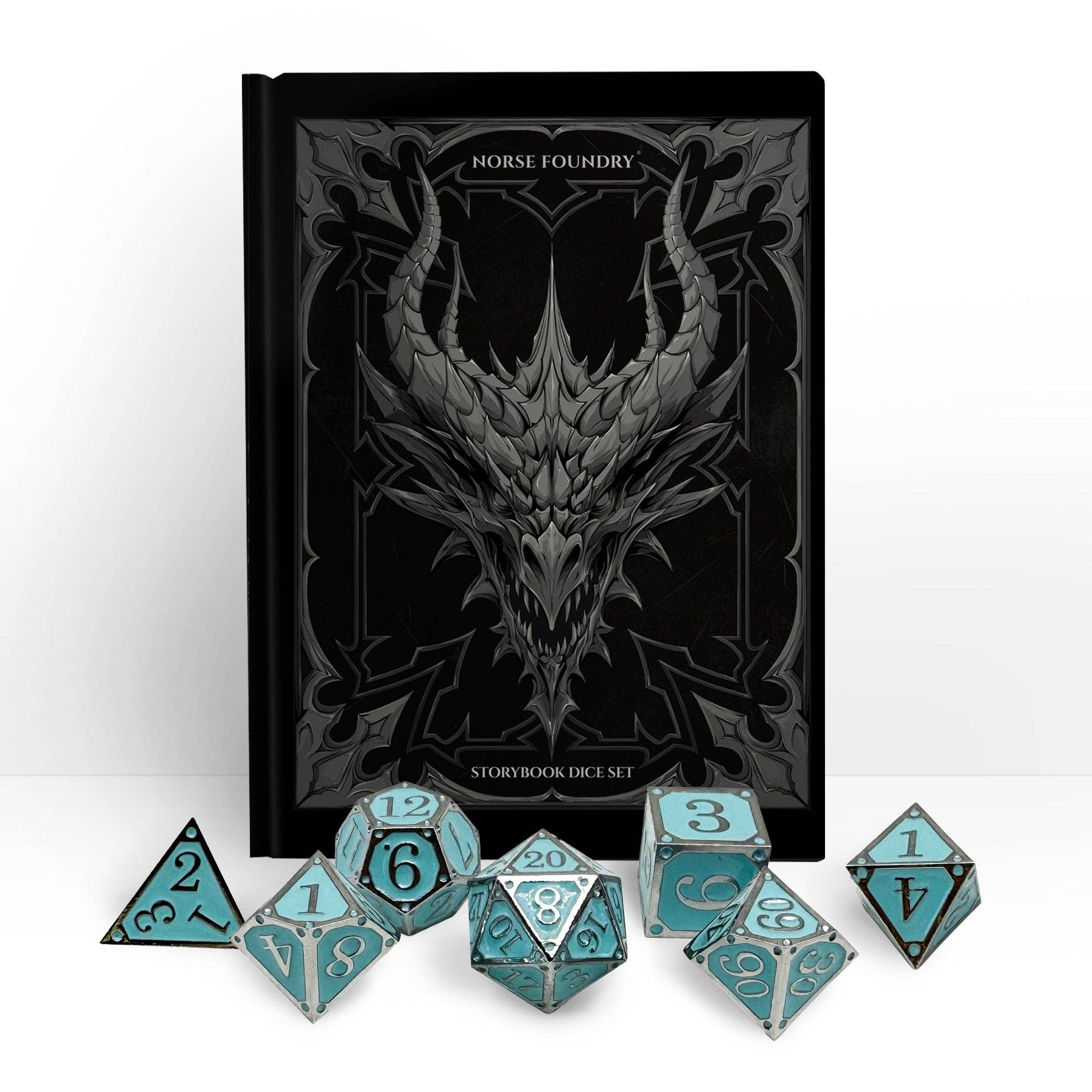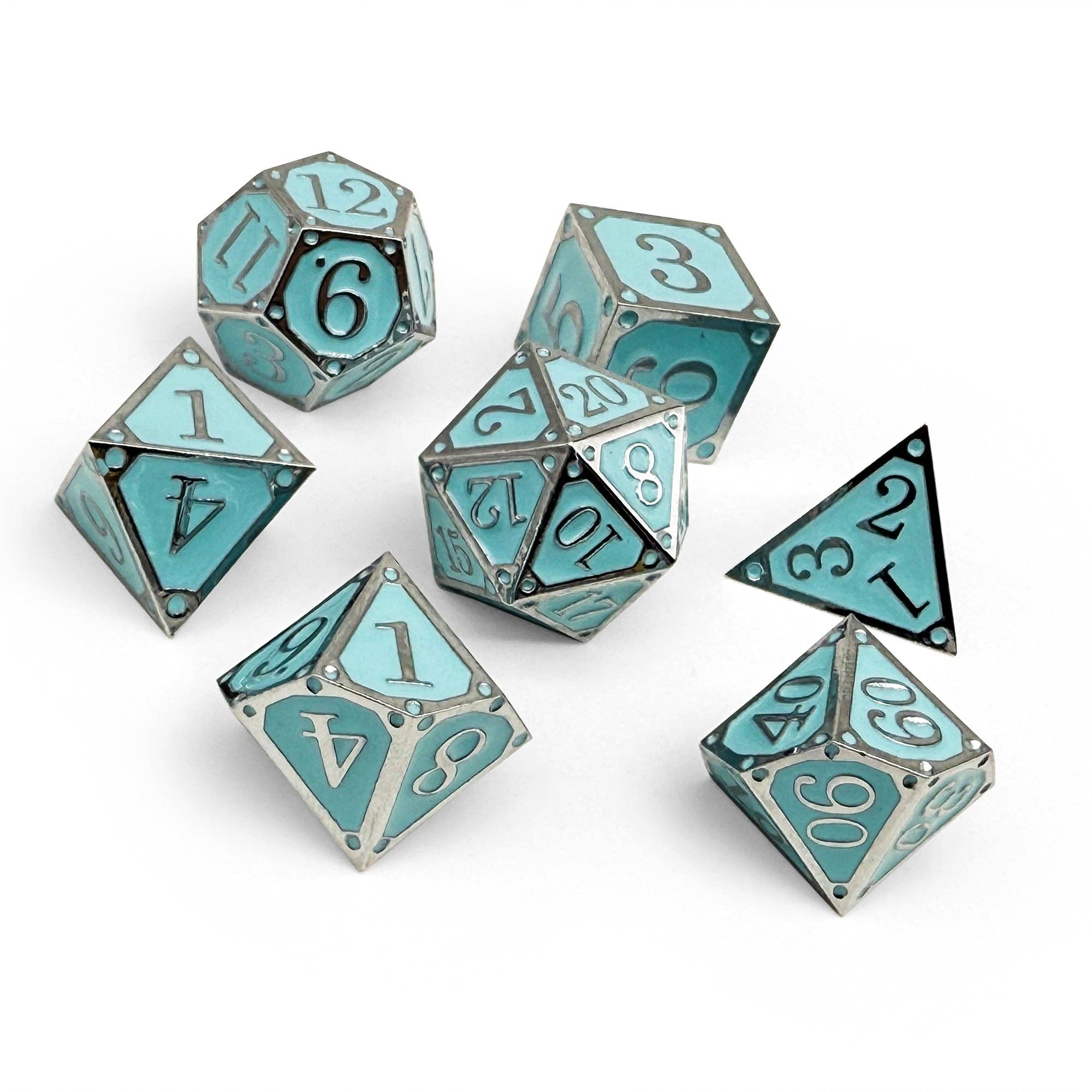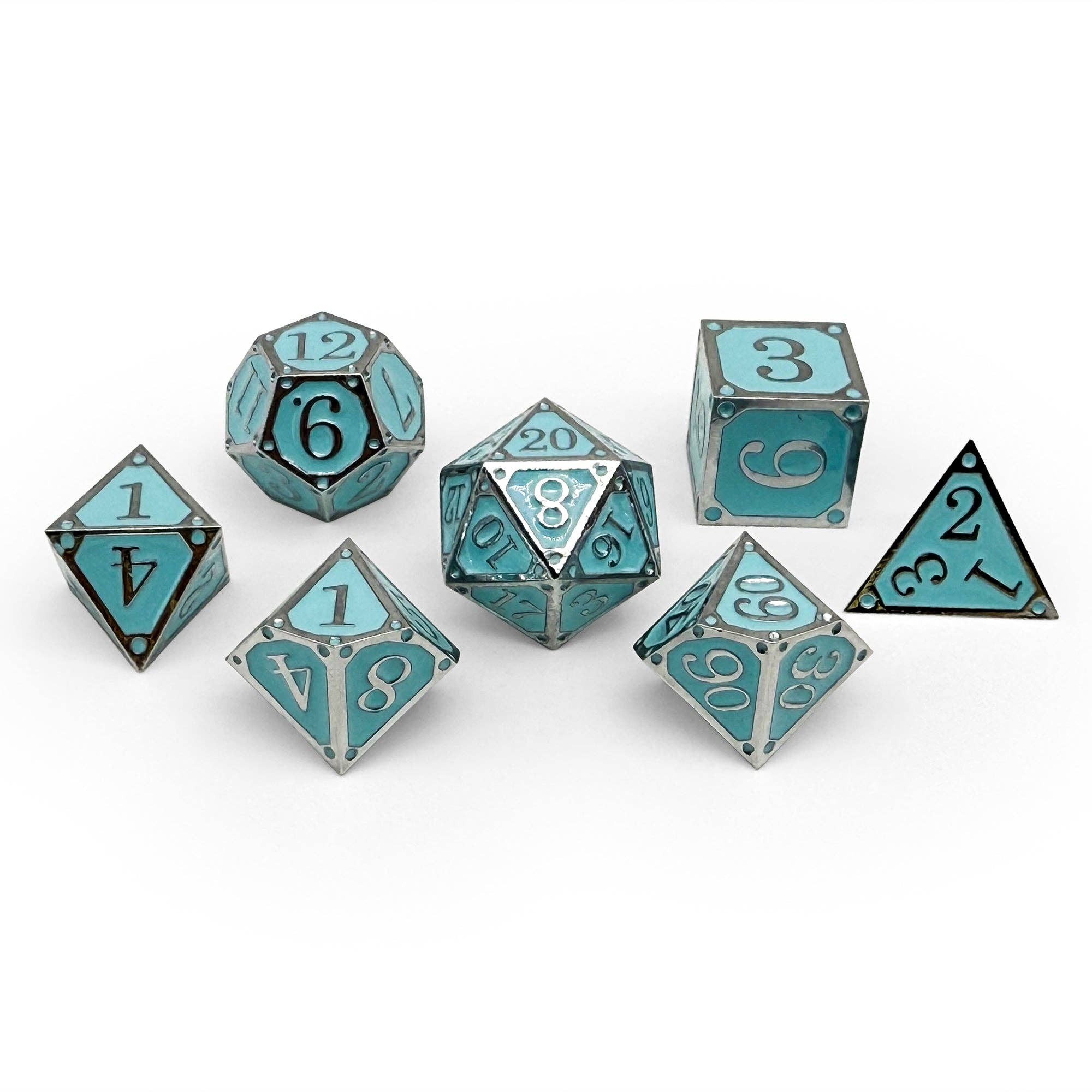 Descend into the unending depths with the Storybook – The Endless Oubliette dice set. Forged in gleaming silver and filled with vibrant turquoise enamel, these dice capture the cold beauty of subterranean halls where time is forgotten. Each roll feels like a step further into mystery — a labyrinth without end, where secrets lie buried and only the boldest adventurers dare to tread.