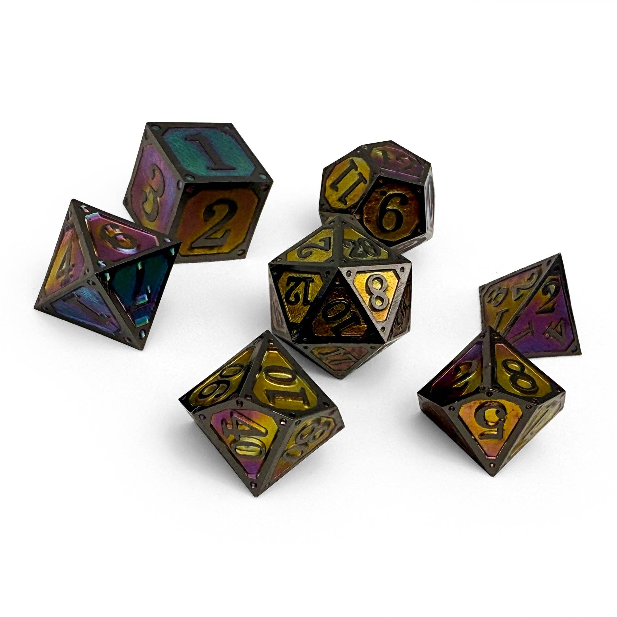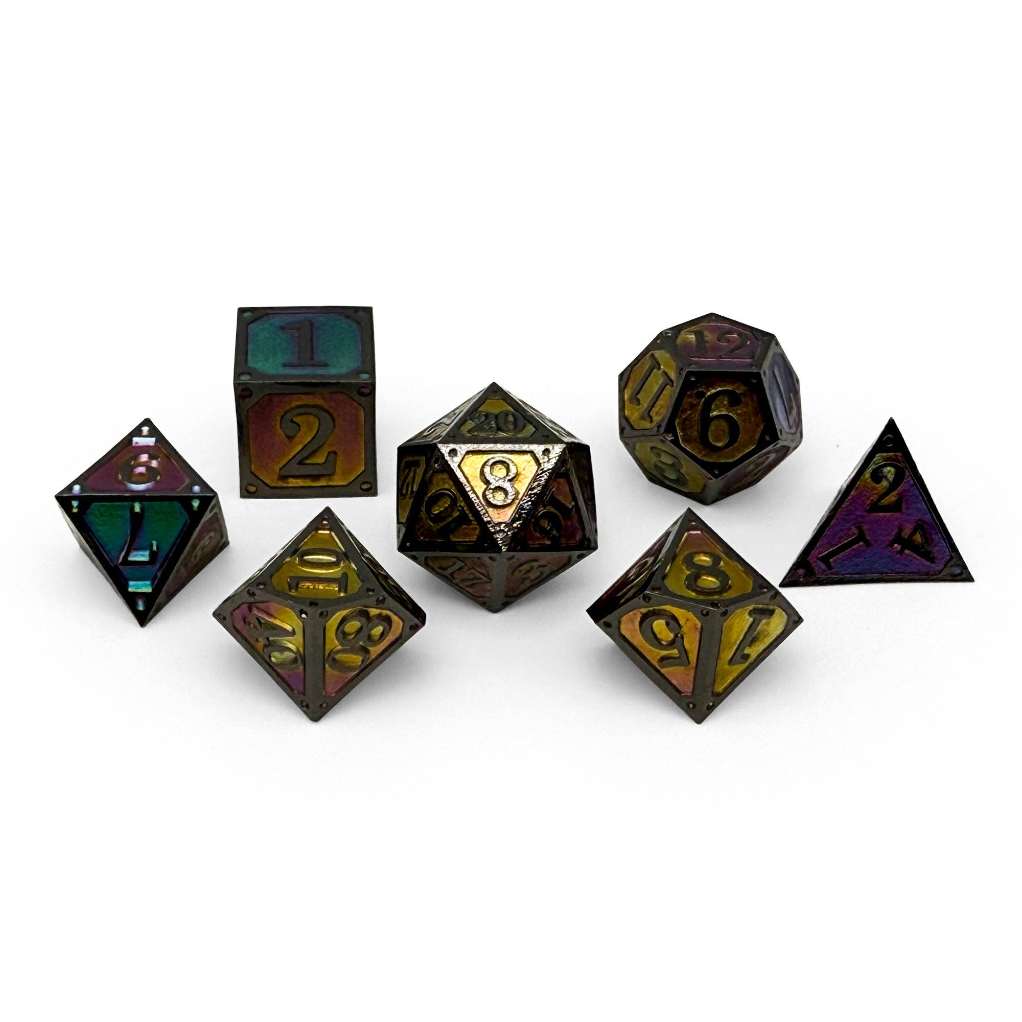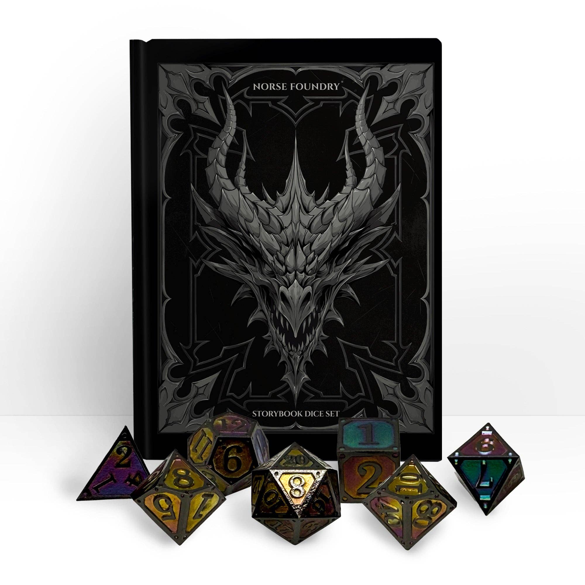 Every story has a beginning, but not every ending is written. The Storybook – Unwritten Fates dice set embodies the mystery of paths yet to be taken, shimmering with iridescent hues of violet, teal, and gold. Framed in a dark metal finish, each roll feels like turning a page in a book that has yet to be completed — where destiny waits to be discovered at the table.