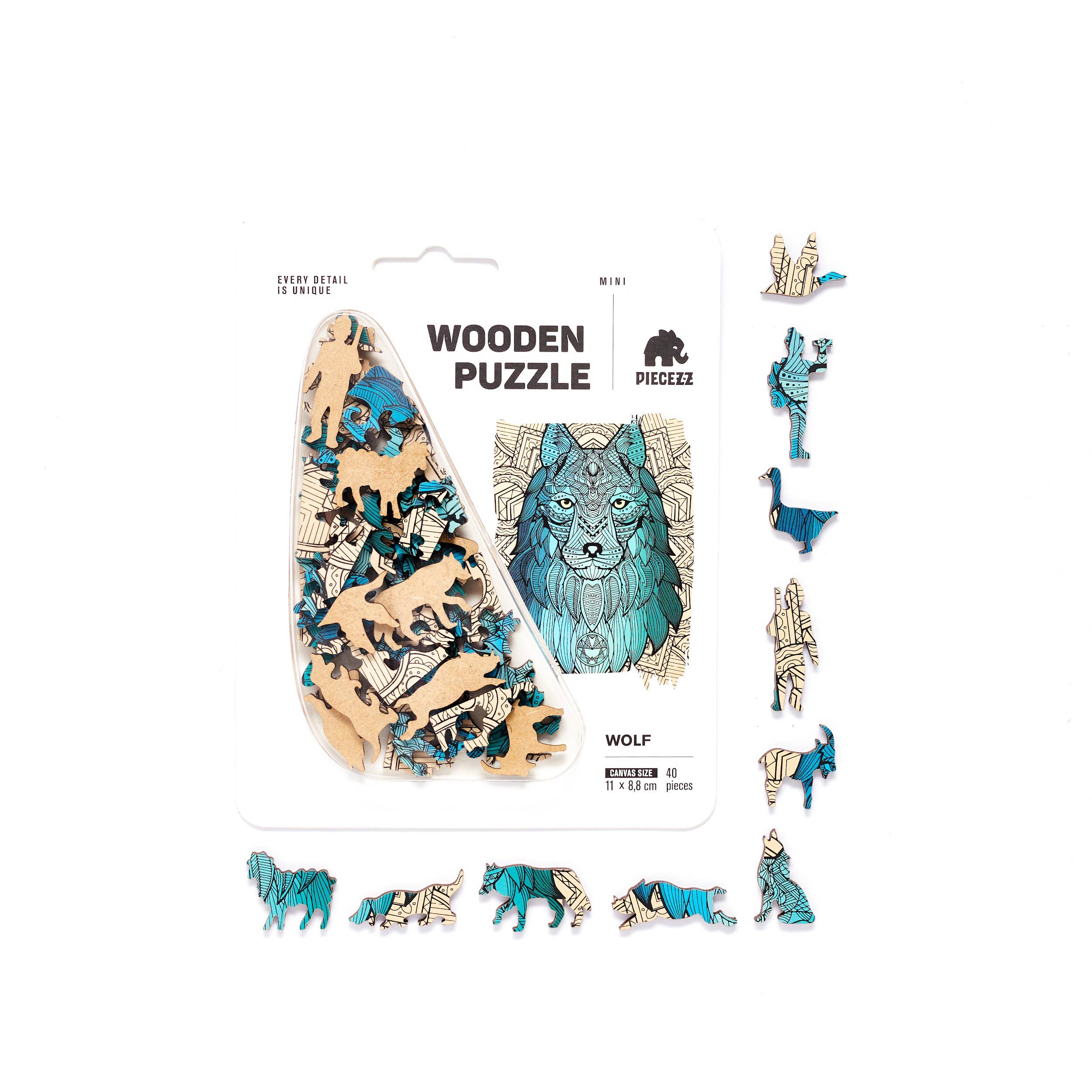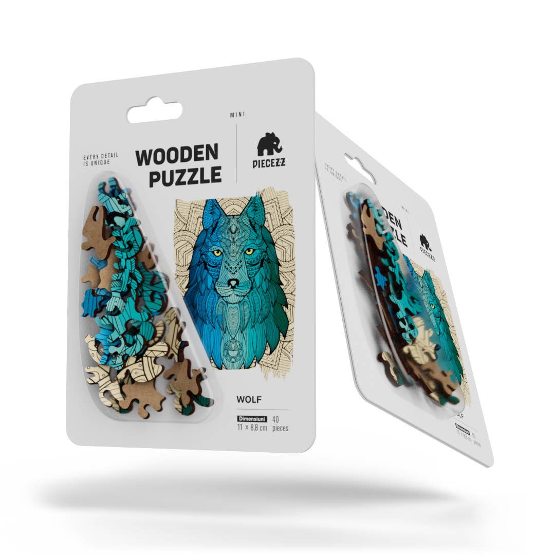 Our smallest puzzle yet - just 40 pieces! Perfect for on-the-go puzzle cravings! Have you paid attention to a wolf puzzle? Your instinct didn't let you down. We greet you, strong-minded and independent puzzle seekers, whose totem animal is a proud wolf. Your main distinguishing feature is your willingness to fight until the last completed puzzle. You have everything you need for this: an inquisitive intellect, a strong character, and close people who are ready to help at any time. Pump up your wit by assembling the Piecezz puzzle from natural wood. This set includes twisting, vibrant figures that all together will turn into a colorful picture of a wolf. Try to assemble it by yourself, and if it doesn't come out great, then call your pack for help.