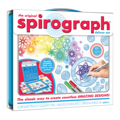 The classic way for aspiring artists to create millions of amazing designs is back and better than ever! The Original Spirograph Deluxe Set features all the iconic wheels and rings of the original, re-engineered and updated for today. The kit features a high quality, durable carrying case with snap-in storage and a built-in drawing surface. The precision engineered Spirograph gears work with the three design pens included in the set as well as with most standard pens, markers and pencils. Spirograph putty holds the Spirograph pieces securely on the paper so that you can create intricately beautiful designs with no holes in the paper! The set also comes with 20 sheets of design paper and a full-color design guide, which explains the fundamentals of drawing with Spirograph, as well as step-by-step instructions for creating your own designs!
