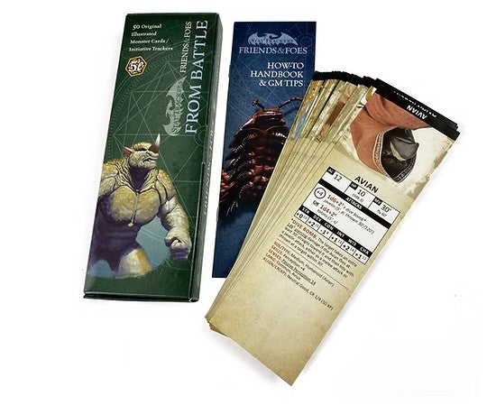 50 spectacularly-illustrated DnD monsters on dry erase friendly stat cards. Just fold them over the DM screen or prop up on the table for easy reference and tracking initiative. “From Battle” contains our own creations for 5e / 2024 DnD– including new golems, orcs, sahuagin, ogres and giants, and introducing deepspawn, beastmen, mantids,, and many more. Surprise and challenge even the most veteran players with these unique creatures!