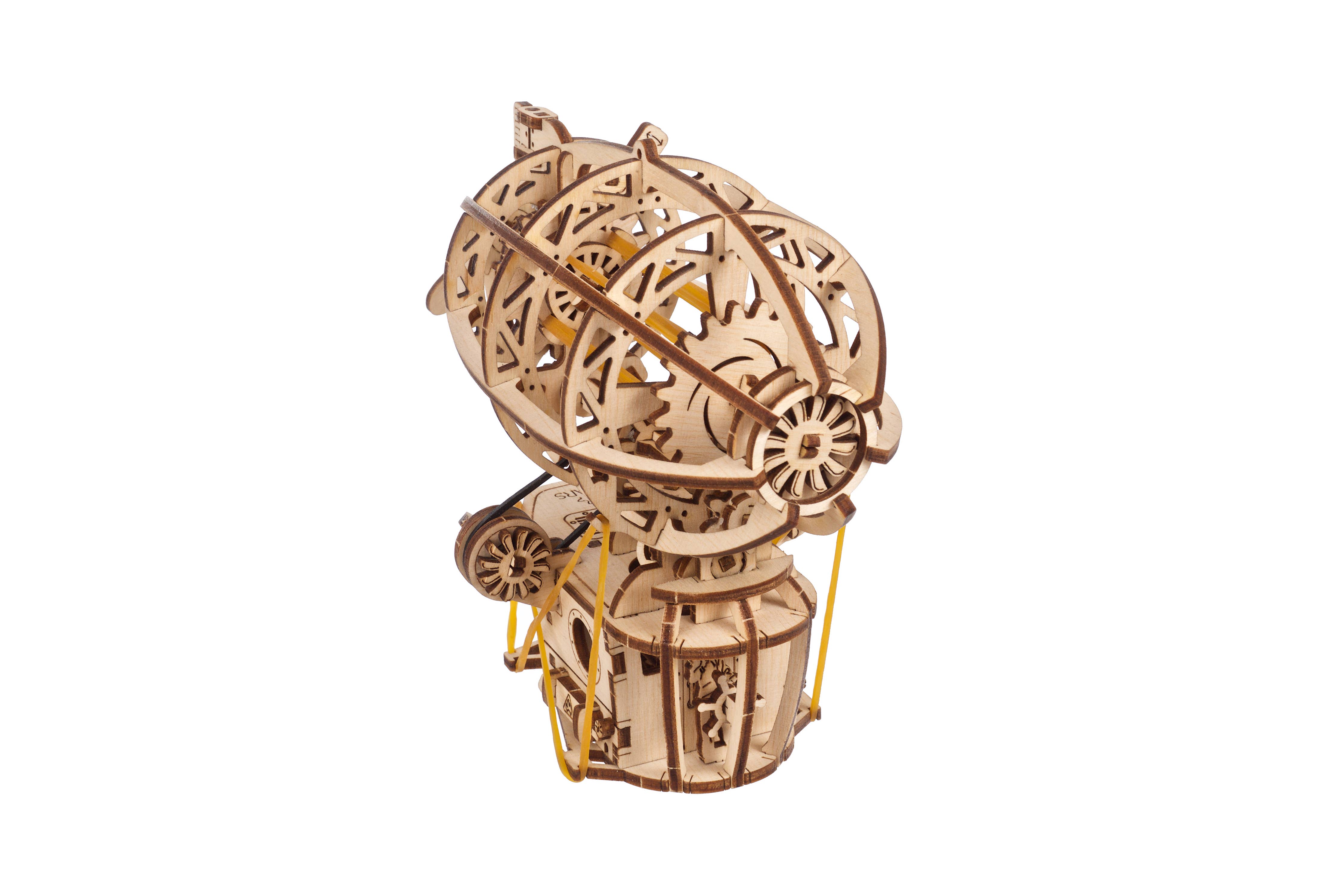 Assemble me. Take to the skies for grand adventures! Build a cabin in the sky, suspend it from a balloon and soar away through the clouds on grand adventures with the Steampunk Airship, a fanciful wooden mini model zeppelin. This DIY mini dirigible has that throwback steampunk sensibility Ugears is known for, with a tugboat-style cabin and back porch, wind-up rubber band motor with Start/Stop switch, engine-driven propellers, spinning ship's wheel, movable stabilizers, and wheels that allow the model to turn back and forth up to 2m along a flat surface, giving the thrill of mechanical motion. Our whimsical Airship features only 170 parts and is rated "Easy" so that even beginners can build this fanciful flyer.
